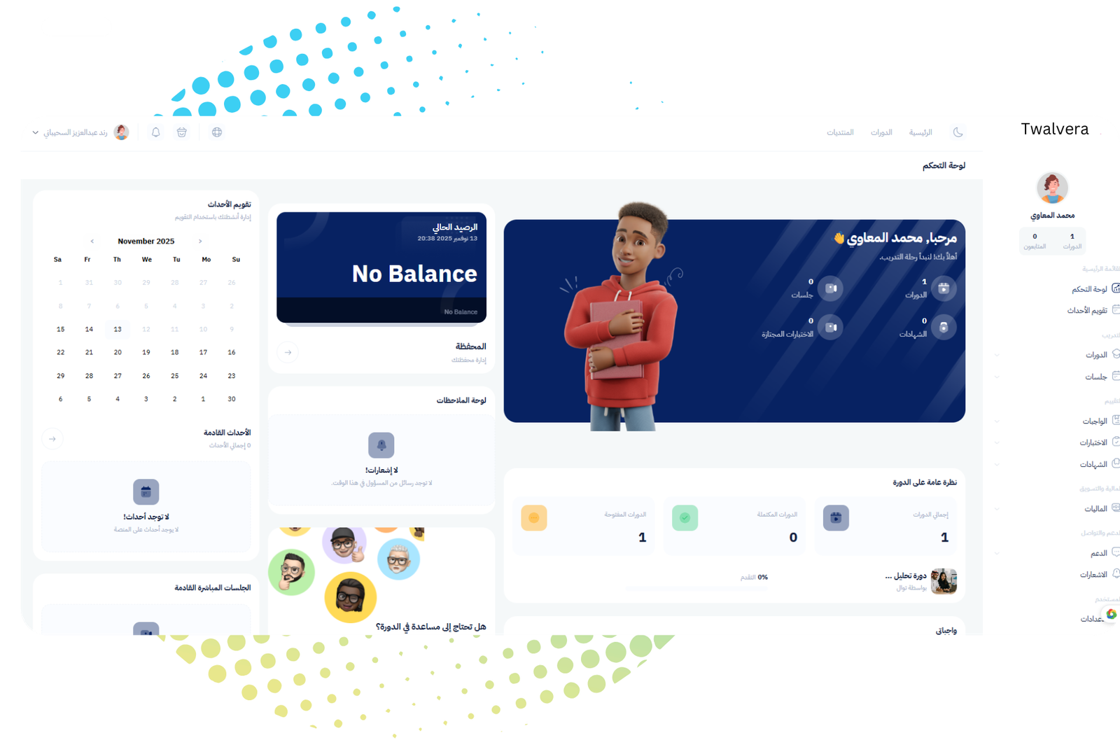 المنصة توحّد كل شيء: إنشاء البرامج، الحضور، الاختبارات، التقارير، الشهادات، والفواتير—كلها تتم أوتوماتيكيًا. تقلل عليك العمل اليدوي بنسبة كبيرة وتمنحك رؤية واضحة لكل شيء من مكان واحد.